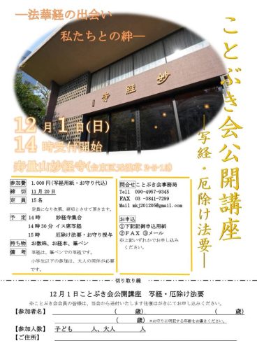 12月1日、ことぶき会公開講座を行います。 今回は、写経と厄除け法要です。 詳しくは添付して…