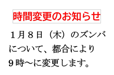 1月8日「ズンバ」は、都合により、 9時からに変更いたします。