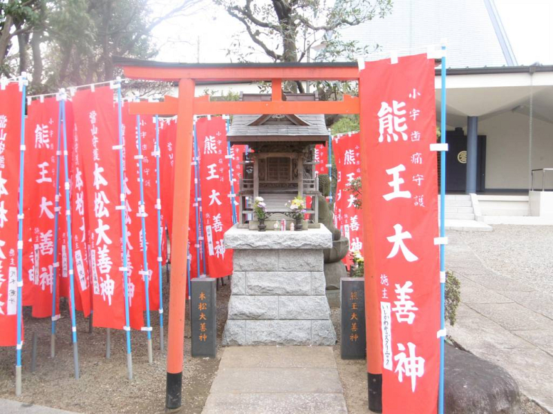 現在、本堂の傍に小宇歯痛守護熊王大善神・当山守護本松大善神が合祀されておりますが、以前は本松大明神とされ陀枳尼天でした。当山裏山に年老いた狐が住みつき、害を及ぼすことが多かった為、何代かの上人がその狐を封じ込んで守護とされました。