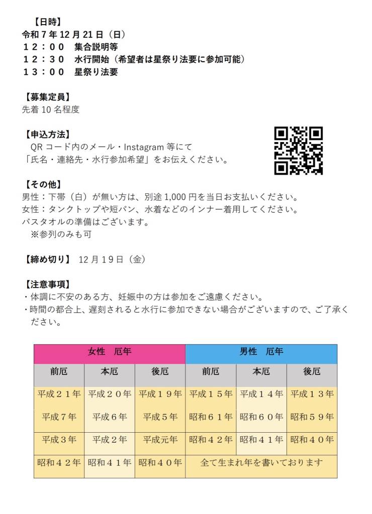 ・時間の都合上、遅刻されると水行に参加できない場合がございますので、ご了承ください。