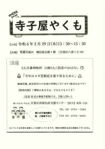 寺子屋やくも 2月29日(木)、13時30~15時30 常圓寺 檀信徒会…