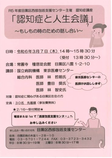認知症講座「認知症と人生会議」 3月7日(木)、14時~15時30分 常…