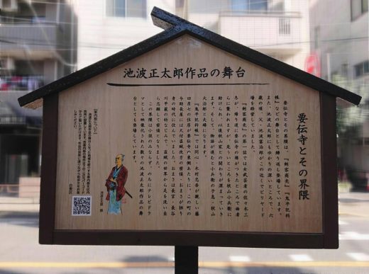 現在、要傳寺のある台東区では、「池波正太郎生誕100年」を記念し、同氏の功績や作品の世界観を広く伝えるとともに、その魅力に触れていただくため、令和5年1月から一年を通して記念事業を実施しております。これにあわせ、『鬼平犯科帳』『剣客商売』など池波作品に登場した区内16箇所に江戸時代の「高札」をモチーフにした案内板を設置し、作中の様子や背景などを通じ、その地域の紹介がなされております。