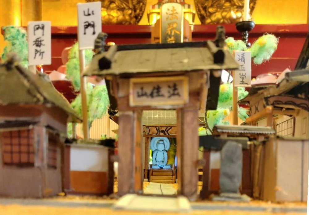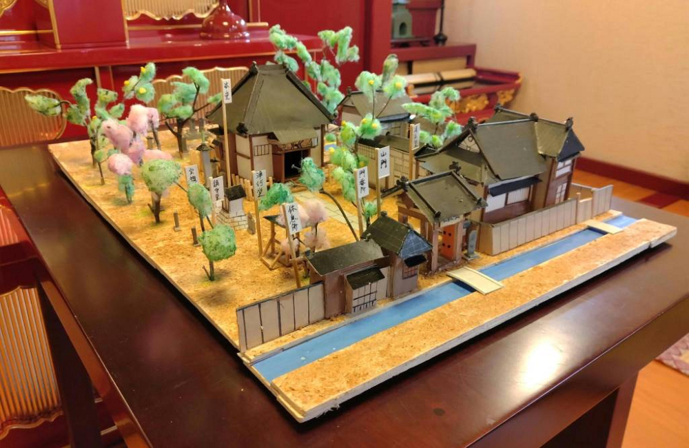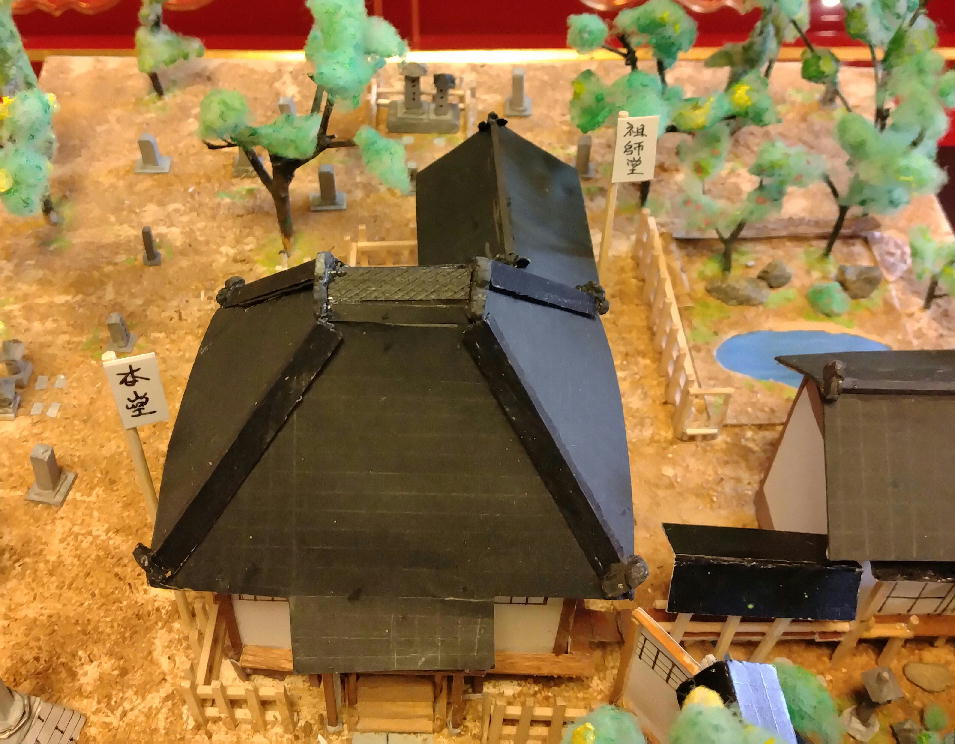 明治37年(1904)5月、龍賀の画、如水の刀になる銅板画『東京市下谷区上根岸町 日蓮宗法住山要伝寺之景』(審美館製、要伝寺蔵)をもとに当時の伽藍を再現した立体模型で、銅板画に描かれない部分は想像して制作されたとのこと。