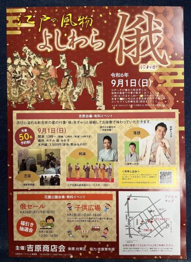 吉原商店会が主催する「よしわら俄」が9月1日(日)に行われます。吉原 俄とは夜桜、玉菊灯籠…