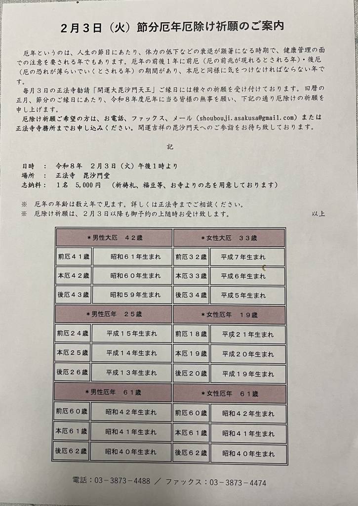 毎月3日の「開運大毘沙門天王」ご縁日には種々の祈願を受け付けております。旧暦の正月、節分にあたり、令和8年度厄年に当る皆様の無事を願い、下記の通り厄除けの祈願を申し上げます。