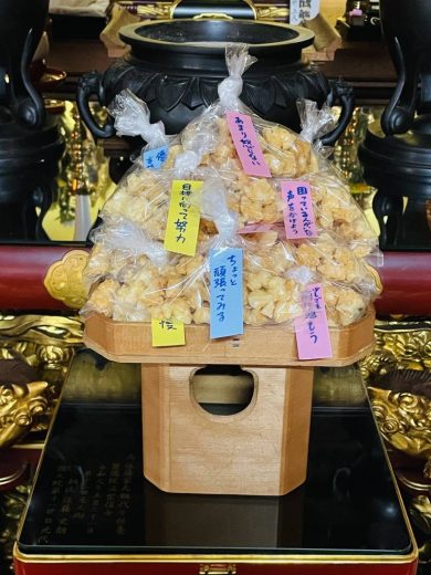 お中日法要を行いました。 かき餅をたくさん作り、袋の上に六波羅蜜らしき言葉を書いた付箋を貼り…