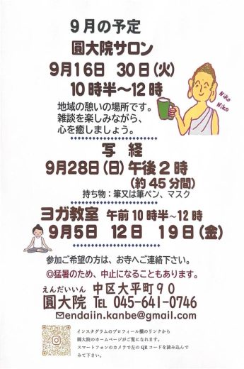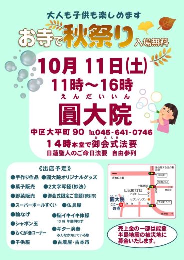 秋祭りには圓大院オリジナルグッズも販売します。14時からの法要は自由参列です。 本堂に座ると…