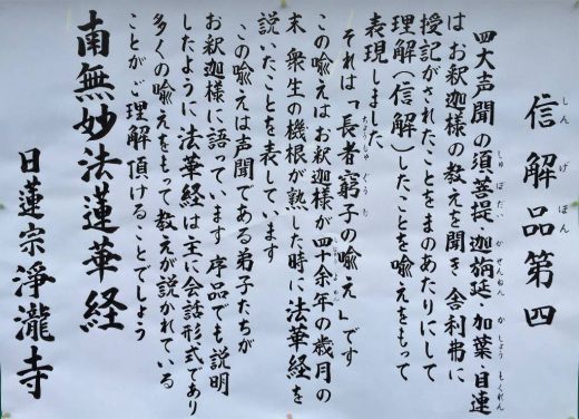 平成30年4月の掲示板は「妙法蓮華経 信解品第四」です。