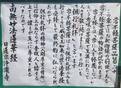 令和元年10月の掲示板は「妙法蓮華経 常不軽菩薩品第二十」です。 本章では、常不軽という菩薩の…