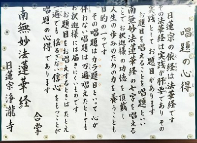 12月の掲示板は「唱題の心得」です。 日蓮宗では妙法蓮華経(法華経)を依経(拠り所とするお…