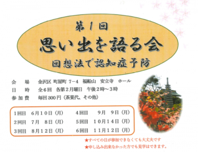 6月10日(月) 午後2時より1時間程で、「第1回 思い出を語る会 回想法で認知症予防」を開催い…