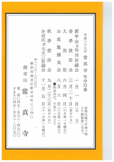 平成29年度 行事予定 新年会並特別祈祷会 1月1日(元旦) 春季彼岸会&…