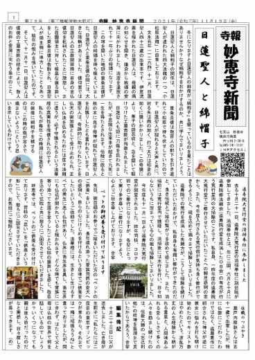 今号では、「日蓮聖人と綿帽子」と題しまして、わかりやすくまとめております。