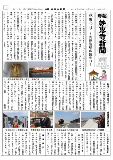 こんにちは、副住職です。 妙恵寺新聞第11号が完成いたしました。 今回は、4月の仏教行事「花まつり…
