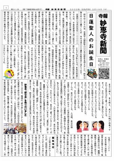 妙恵寺新聞第81号「日蓮聖人のお誕生日」