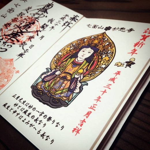 七面大明神と共に、今年の干支である戌のイラストをあしらった新春仕様となっております。