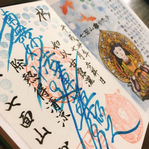 また見開きテイストで当山オリジナルの七面大明神イラストは、水色御首題と合わせ、涼やかで流れゆく水に囲まれた「水色」仕様となっております。