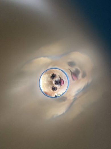 こんにちは 愛犬のぽぽちゃんの写真を載せてみようかとこんな写真を撮りました 筒の中におやつ…