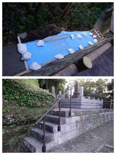 法性寺は、崩れた場所は逗子市で対応していただけることになり、迂回路に使う階段にはお寺で手すりをつけました。(今までは使われていないルートだったので階段のみでした)