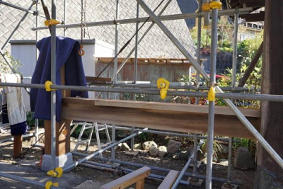 柱作業開始です。 毛布がかぶっている部分までは、今回新しい木材に変わっています。ここから上は、…