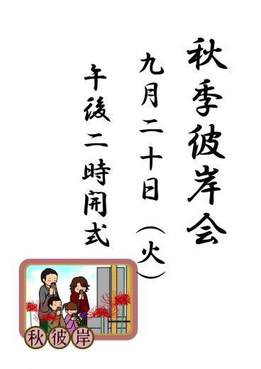 令和4年秋彼岸会 イベント・活動 記事公開日:2022年09月18日 この記事は最終更新日から1年以上経過しています。記事の内容やリンク先については現在と状況が異なる場合がありますのでご注意ください。 開催日:2022年09月20日 当山では春秋とも入りの日に法要を奉行しております。台風が近づいておりますが、現在の予報ですと当日お昼までには雨も止みそうです。 まだまだ感染症も油断できないなかですが、どうぞご無理のない範囲で、ご参拝お待ちしております。 この記事は最終更新日から1年以上経過しています。記事の内容やリンク先については現在と状況が異なる場合がありますのでご注意ください。 PREV NEXT 一覧へ