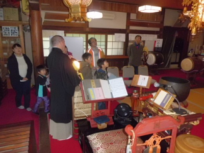雨の降る中、地元の子供達がクイズラリーのポイントで4班に分かれて来寺してくれました。 本堂天井の…