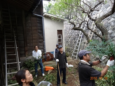 御会式の翌日、片付けに続いて境内の掃除を行いました。本堂裏の崖草刈り・梅の枝切り・排水溝の掃除…