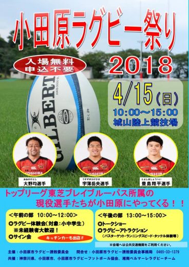 昨年に引き続き、城山陸上競技場で小田原ラグビー祭りを開催します。 今年は、トップリーグ東芝ブレ…