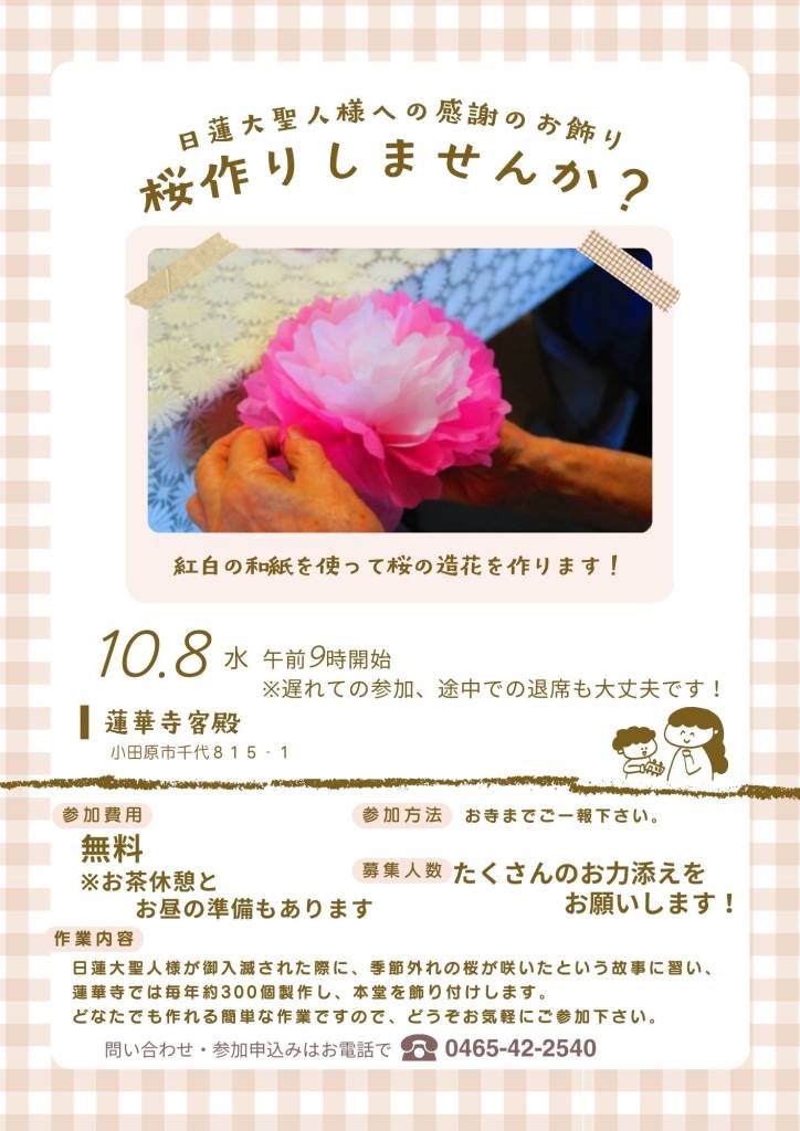 お会式桜を作る会 イベント・活動 記事公開日:2025年10月07日 開催日:2025年10月08日 合掌 日増しに秋の深まりを感じる季節となりました。皆さま如何お過ごしでしょうか。 10月18日(土)に当山の御会式法要が執り行われます。蓮大聖人がご入滅された日に季節外れの桜が咲いたとされる故事に由来し、本堂内に桜の造花の飾り付けをします。 お寺では毎年約400個を和紙にて作成します。 本年は作業を10月08日(木)午前9時より行います。 遅れての参加、途中までの参加などでも構いません。1人でも多くの方のお力添えをお願い致します。 PREV NEXT 一覧へ