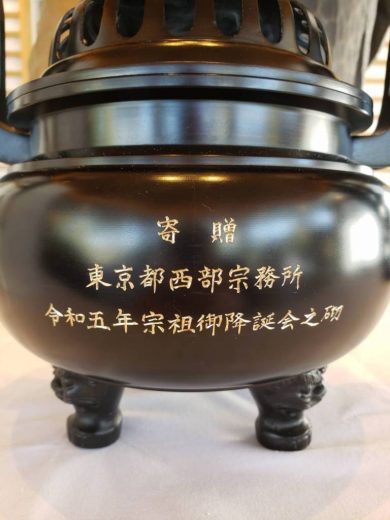 今回は、出仕各教師が経机・鏧子・木鉦・曲録などの仏具を持ち寄り法要を行いました。東京都西部宗務所では宗祖御降誕会の記念に五具足を奉納いたしました。