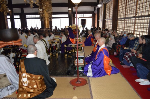 国祷会に先立ち、管内寺庭婦人会による和讃の奉納がされ、その後、上田日瑞貫首導師にて修法師20名と行僧3名で世界平和と参拝者の幸福を願って大国祷会が行われた。150名を超える参拝者で本堂内は一杯になり、一心に合掌しお題目を大きな声で唱えていた。