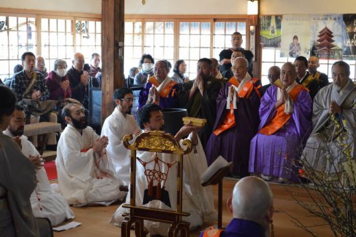 京都市上京区華光寺(浅野耀泰住職)で2月11日、副住職である浅野泰彰師の第初行帰山奉告式が僧侶・檀信徒約200名が参列する中行われた。