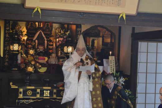 式では前住職明渡恵昌師より払子が継承され、京都府第一部宗務所所長橋本一妙師より梅本政秀上人への住職承認の辞令伝達、払子を継承された新住職は力強く奉告文を読み上げ、三宝給仕、檀信徒教化並びに広宣流布、正法興隆し立正安国浄仏国土を顕現することに精進することを誓った。また入寺に際し、京都市上京区本山本満寺貫首伊丹日章猊下より祝辞が述べられ新住職を激励した。