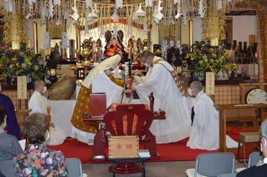 大祭では子の妙見さまの善行院(児玉純人住職)より、丑の妙見さまの本山本満寺(伊丹日章貫首)へ宝剣が引き継がれた。
