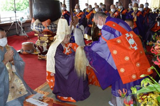 6月の気候とは思えないほどの雲一つない快晴に恵まれた中、24日京都市左京区にある本山法鏡山妙傳寺で第85世村瀨日隆貫首(愛知県名古屋市大光寺住職)の晋山式が、日蓮宗中川法政宗務総長、身延山久遠寺小澤惠修庶務部長、京都八本山会貫首、全国本山会貫首、法縁各聖、檀信徒の100名が参列し行われた。