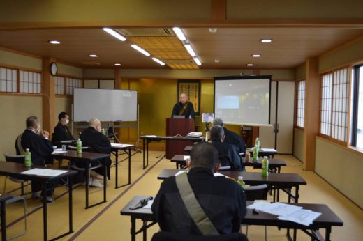約40ページにわたる講題資料を基に講演され、受講者はペンを走らせていた。最後には受講者より質疑応答の時間も設けられた。 宗務所に足を運べない遠方の受講者でもオンライン受講により気軽に受講しやすく、今後もより一層の受講者の参加が求められる。