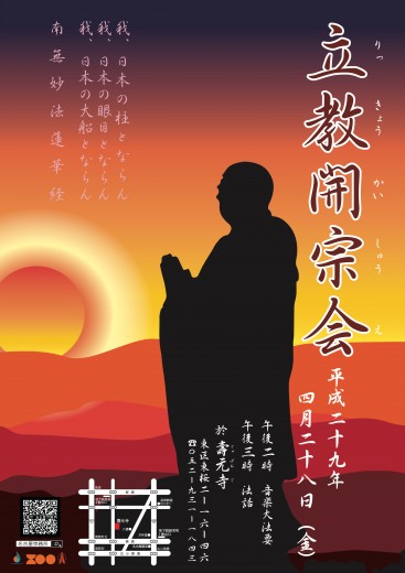 ※立教開宗会とは京畿遊学を終えた日蓮聖人が建長(けんちょう)5年(1253年)4月28日に生まれ故郷である千葉県小湊 清澄寺の旭が森山頂に立ち、お題目「南無妙法蓮華経」を唱え、法華経の弘通を宣された聖日のこの日に営む法要会の事です。