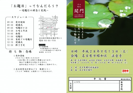 名古屋檀信徒協議会研修会「唱題行」のご案内 イベント・活動 記事公開日:2016年07月23日 この記事は最終更新日から1年以上経過しています。記事の内容やリンク先については現在と状況が異なる場合がありますのでご注意ください。 平成28年9月13日(火)、昭和区 法音寺に於いて名古屋檀信徒協議会主催の唱題行を行います。 詳細は案内チラシをご覧下さい。 この機会に自分の心を見つめ直してみてはいかがでしょうか。 皆様のご参加お待ちしております。 この記事は最終更新日から1年以上経過しています。記事の内容やリンク先については現在と状況が異なる場合がありますのでご注意ください。 PREV NEXT 一覧へ