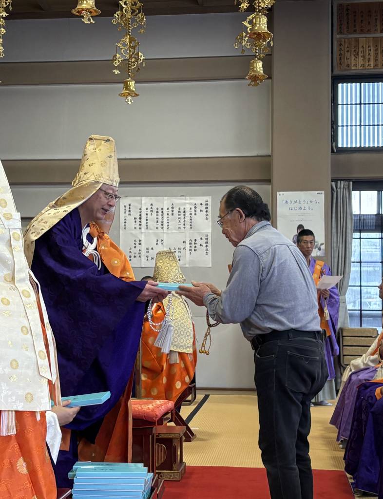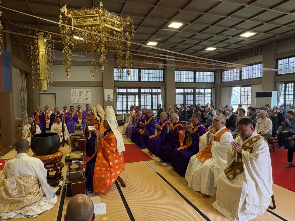令和7年4月28日(火)午後2時より東区 壽元寺に於いて導師に天野行淳宗務所所長、副導師に石黒泰良上人、亀廣慈宗上人を迎え、式衆に管内有縁の各聖、伶人に聲明師会雅楽部員出座のもと立教開宗会音楽大法要を厳修しました。また、法要終了後、管内行事にこれまで多数参加された方(「参るポイント」300ポイント通過者)に対して、天野所長より記念品の授与があり、会場は大きな拍手につつまれました。その後、名古屋市布教師会長 西区円頓寺ご住職塩田宝裕上人による法話がございました。