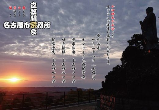 オンライン立教開宗会 イベント・活動 記事公開日:2021年04月27日 この記事は最終更新日から1年以上経過しています。記事の内容やリンク先については現在と状況が異なる場合がありますのでご注意ください。 開催日:2021年04月28日 本年度の立教開宗会は 名古屋聲明師会会員出仕のもと オンラインにて法要を営みました。 ⬜︎暗闇から旭日が昇る当時の情景を模して法要を営みました。 「立教開宗会」音楽大法要(Youtube ライブ) 日時:令和3年4月28日(水) 音楽法要 15時00分 所長挨拶 15時30分 閉式予定 15時40分 この記事は最終更新日から1年以上経過しています。記事の内容やリンク先については現在と状況が異なる場合がありますのでご注意ください。 PREV NEXT 一覧へ