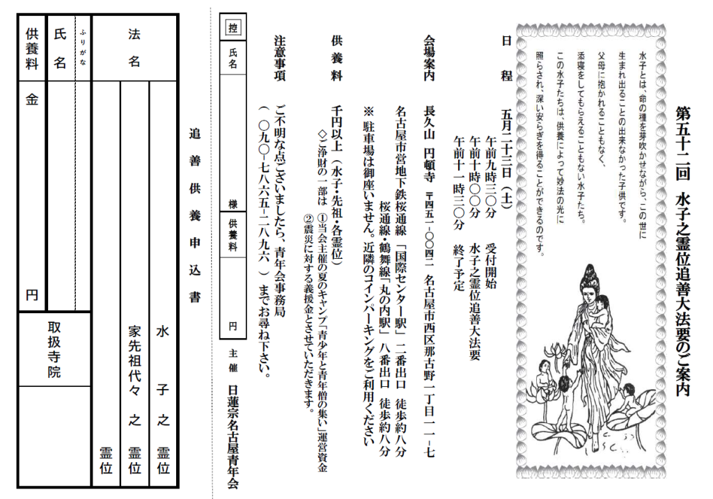 名古屋市青年会主催「第52回 水子之霊位追善大法要」のご案内です。