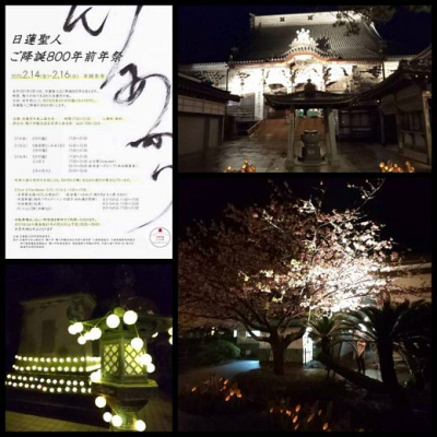 誕生寺では宗祖降誕800年前年祭が開催中です。 14日の夜は生憎の雨模様でしたが、ライトアップされた…