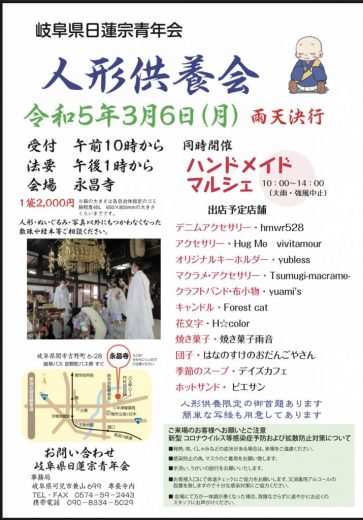 岐阜県日蓮宗青年会にて今年も人形供養会が執り行われます。 令和5年3月6日(月) 本年の会場は、関…