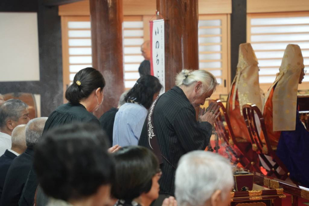 開堂供養を終えたばかりの本堂には、佐賀県中の僧侶と檀信徒が集まり、松島貫首を導師として、参加者全員でお題目を唱え、お焼香を供え、かつての戦争によって失われた多くのいのちに追善の祈りを捧げた。