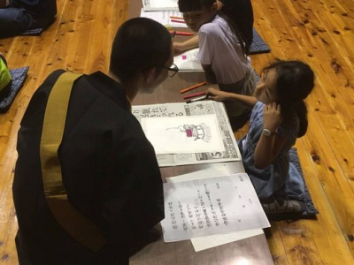 カレー作りの後は信行で写仏・写経を行いました。 会員が写経の意義を説明し、子どもたちは一生懸命…