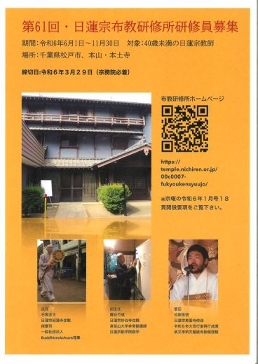 只今第61回日蓮宗布教研修所研修員募集中です。 40歳までの宗門教師の皆さん! 奮ってご応募…