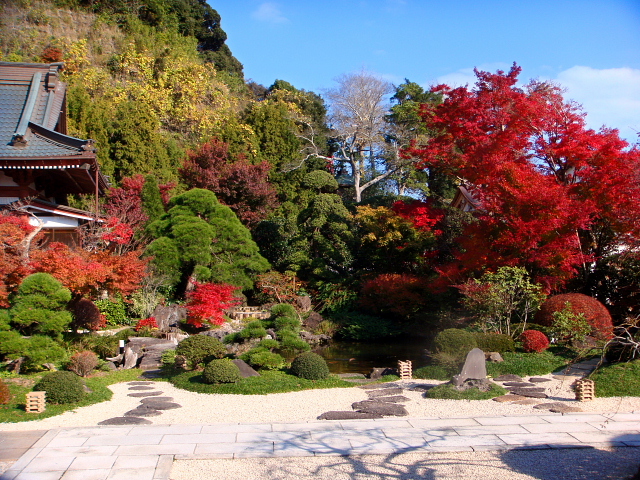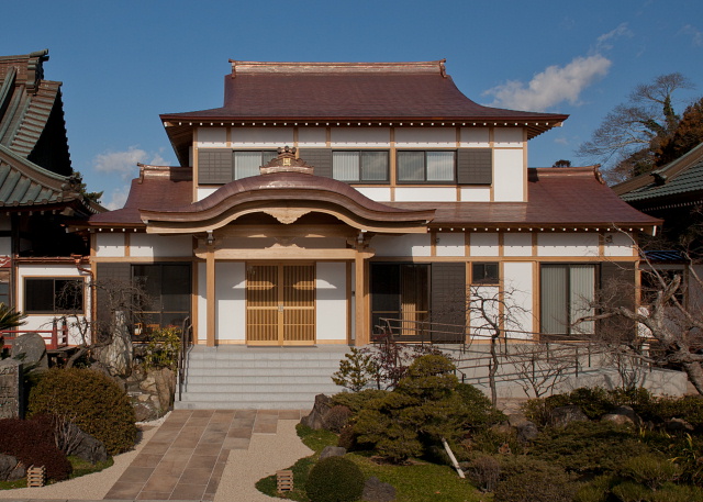 本行寺は、緑に囲まれた平坦地にあり、池を配した趣のある日本庭園が美しい、白壁瓦塀に囲まれた心安らぐ瀟洒な空間です。 四季折々の花々や、もみじをはじめ木々の新緑や紅葉の景色は格別です。JR成東駅から徒歩8分、山武成東インターから車で8分と交通の便にも恵まれています。日々、住職の読経回向を受けられる境内墓地には永代供養墓もあり、亡き人を偲ぶには最適の場所でしょう。現在建て替え中の庫裡が完成すると諸堂がバリアフリーになります。また、冷暖房を備え、椅子でお参りや休憩をすることができます。現代人のストレスや心の苦悩を取り除く、み仏や日蓮宗の教えを伝える布教活動を行っております。また、地域に開かれたお寺として、さまざまな行事や文化活動を行っております。 本行寺住職 冨永一道