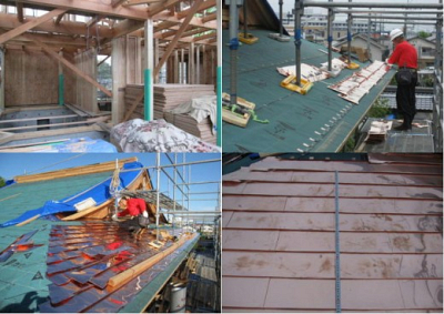 7月2日2階屋根の銅板一文字葺きが西妻側から始まりました。当山に0.35㎜厚さの定尺材(365mm×12…