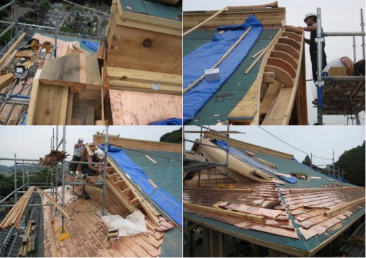 施工は、主に7/5~6の2日間で行われた。最初に駒額(こまびたい)と呼ばれる棟と軒付けを繋ぐ部材を、棟から軒付けへ少し下り勾配を付けて取り付ける。次に杉の35㎜程の厚さの材料をアールを付けて切り抜いた蓑甲の下地になる型板(櫛型とか骨板という)を取り付け、その上に箕甲桟(杉の五分角材)を順に打ち付け曲線を形成していく。仕上げに鉋で削りなめらかで美しい曲線の蓑甲の完成です。